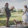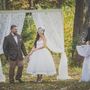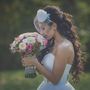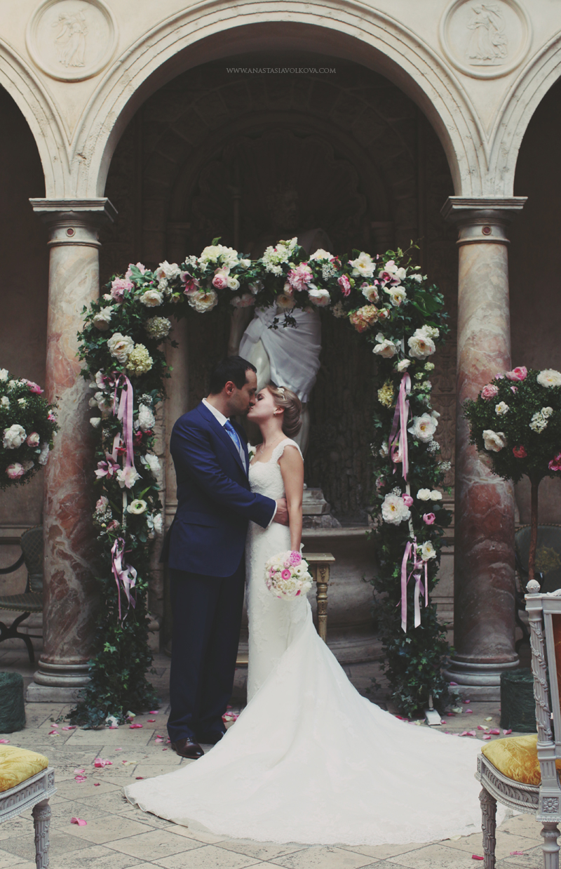 Квадратная арка с композицией из живых цветов, украшенная разноцветными лентами