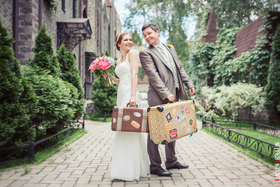 Летняя фотосессия жениха и невесты, в ретро стиле, с использованием коричневого и желтого чемоданов и букета из розовых цветов
