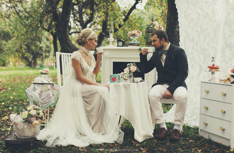 Летняя свадебная фотосессия молодоженов в лесу, у стола возле декоративного белого камина, с использованием белой скатерти,