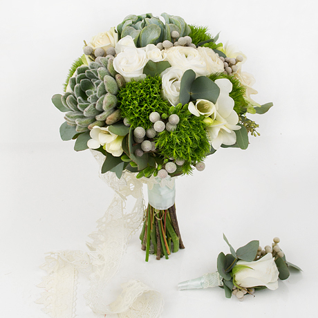 Букет Круглый букет Белый Кружево Фрезии Роза Серый Бруния Зеленый Суккулент Эвкалипт Диантус грин