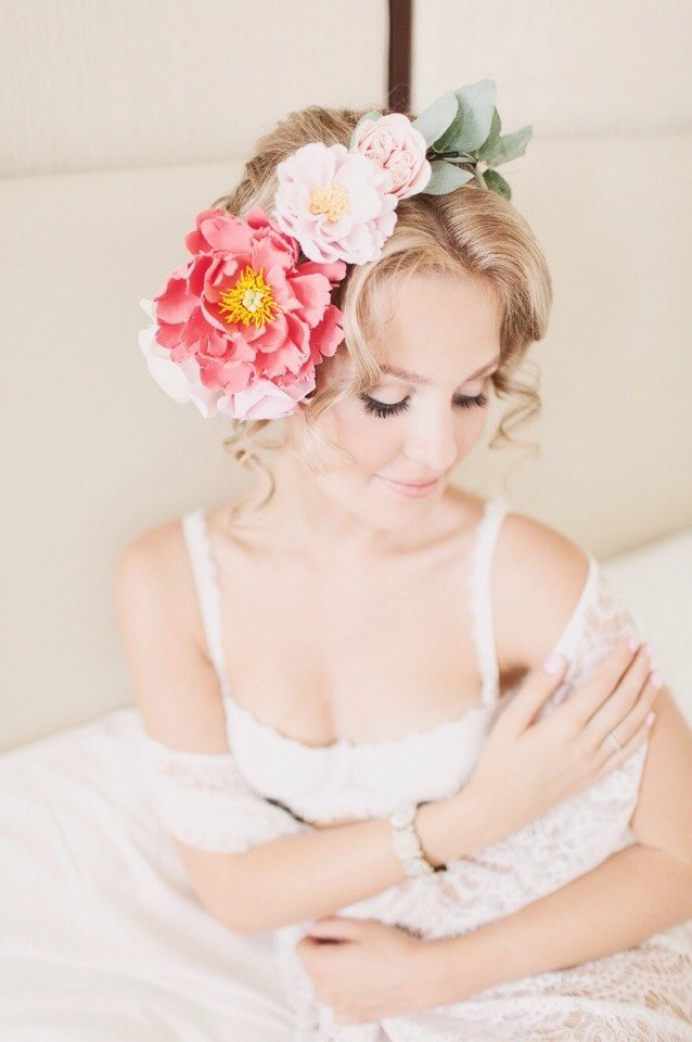 Корона из роз и пионов, прекрасное дополнение для самого нежного утра невесты