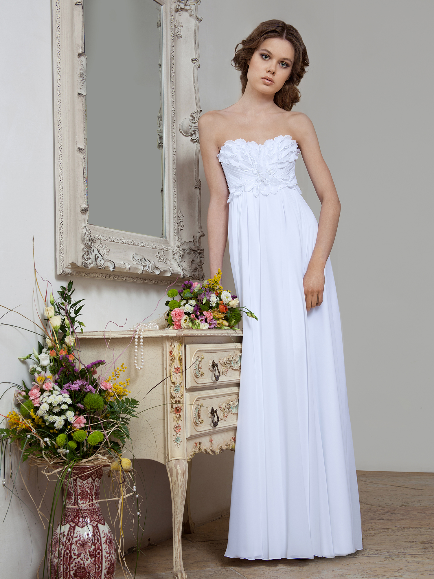 Невеста в прямом белом платье в греческом стиле с лифом декорированным лепестками