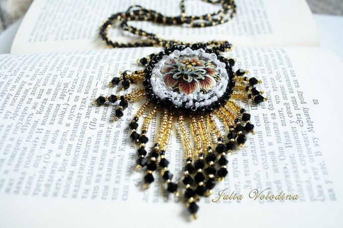 Волшебный нарцисс. Колье из бисера и дерева с росписью хохлома.