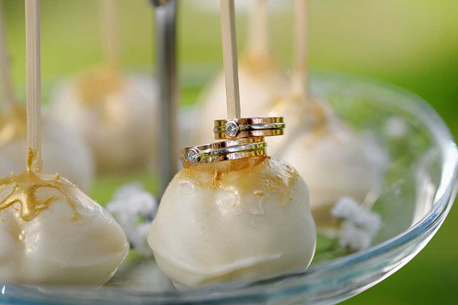 Обручальные кольца из желтого золота с бороздками и бриллиантами, на фоне угощения.
