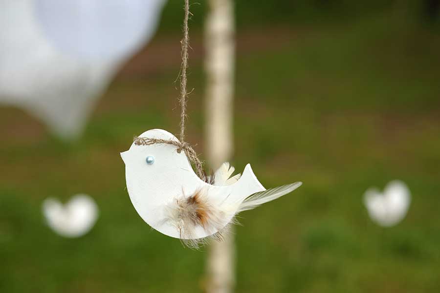 Оформление для фотосессии свадьбы в стиле рустик с использованием подвесной деревянной фигурки птички, украшенной перьями