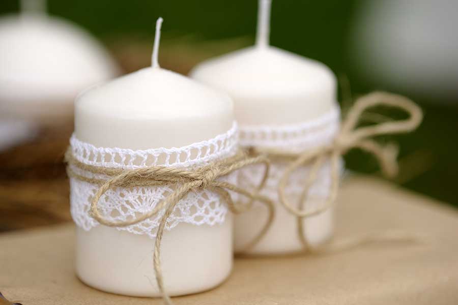 Оформление для фотосессии свадьбы в стиле рустик с использованием белой свечи, украшенной белым кружевом