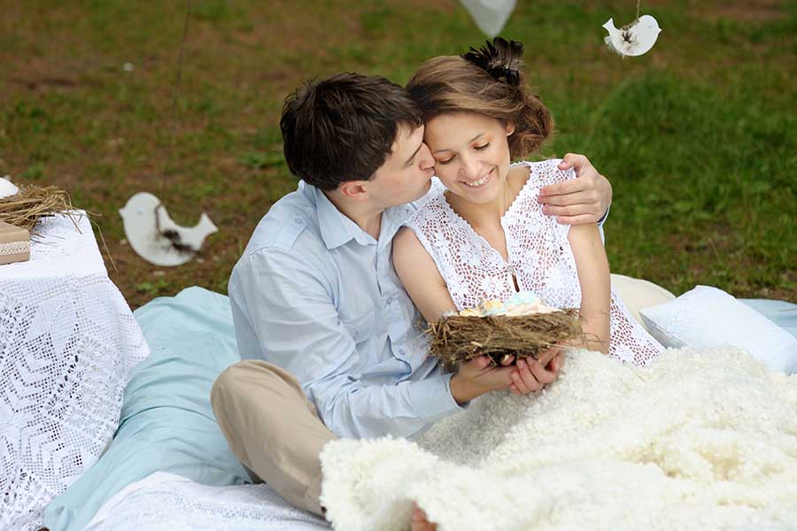 Оформление для фотосессии "love story" с использованием декоративного гнезда и подвесных деревянных фигурок птиц