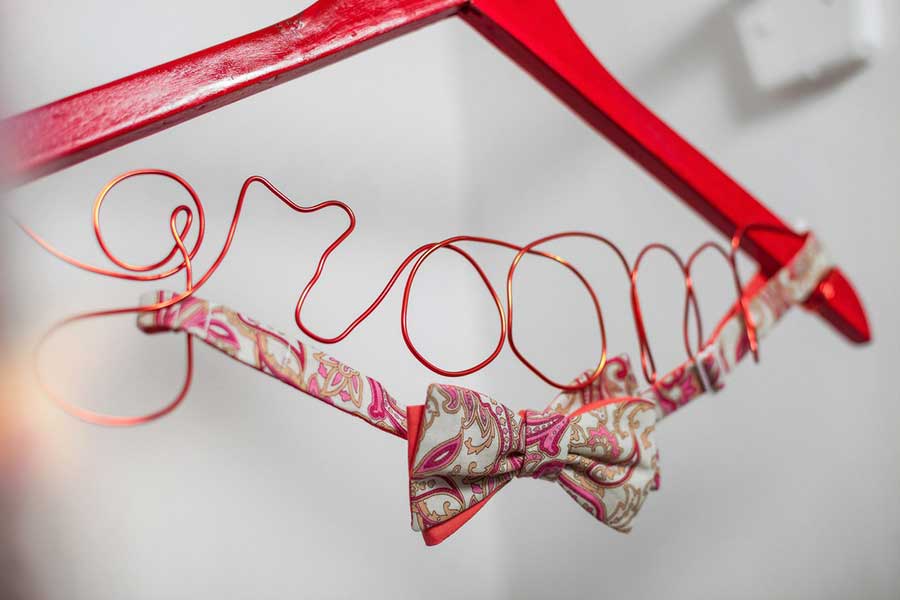 Вешалка-плечико красного цвета, украшенная бабочкой жениха и надписью "groom"