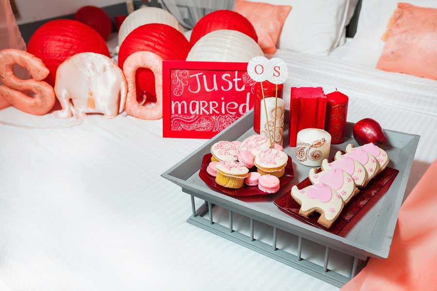 Оформление для фотосессии свадьбы с использованием картины в красной рамке, белых, красных свечей, пирожных на серой деревянной