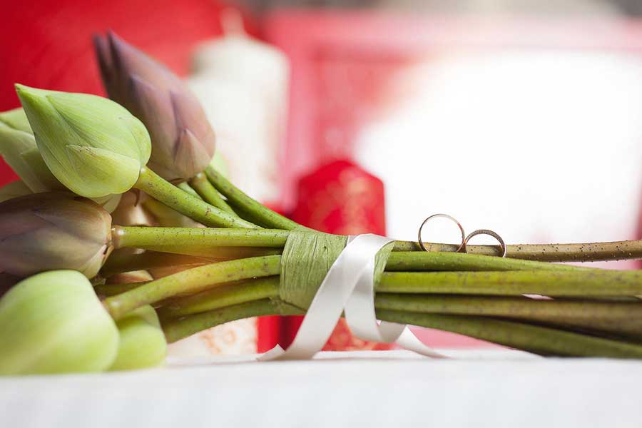 Букет невесты из сиреневых и зеленых бетонов тюльпанов, завязанный белой атласной лентой