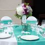 Оформление зала Белый Стол Скатерть Голубой Тканевая растяжка Гортензия Сиреневый Роза Свеча