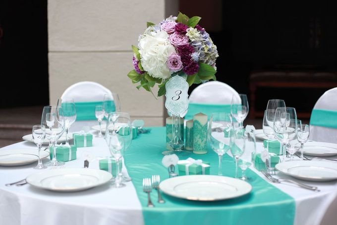 Оформление зала Белый Стол Скатерть Голубой Тканевая растяжка Гортензия Сиреневый Роза Свеча