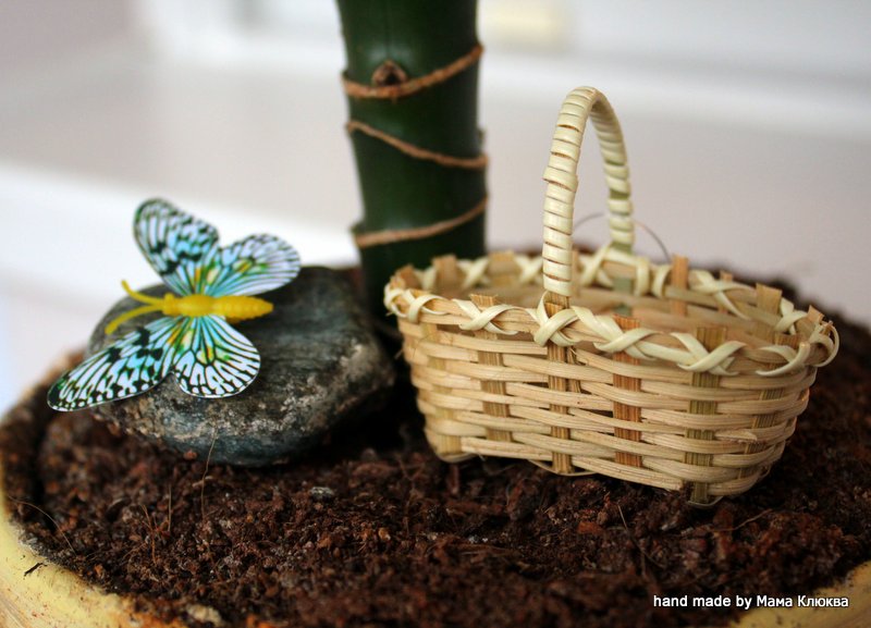 Оформление для свадебной фотосессии с использованием плетённой корзины и бабочки