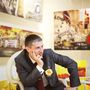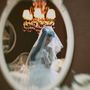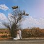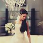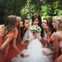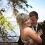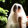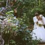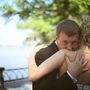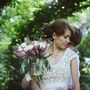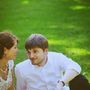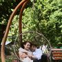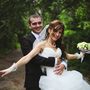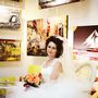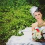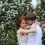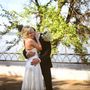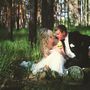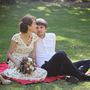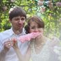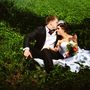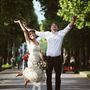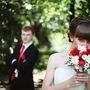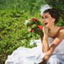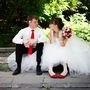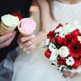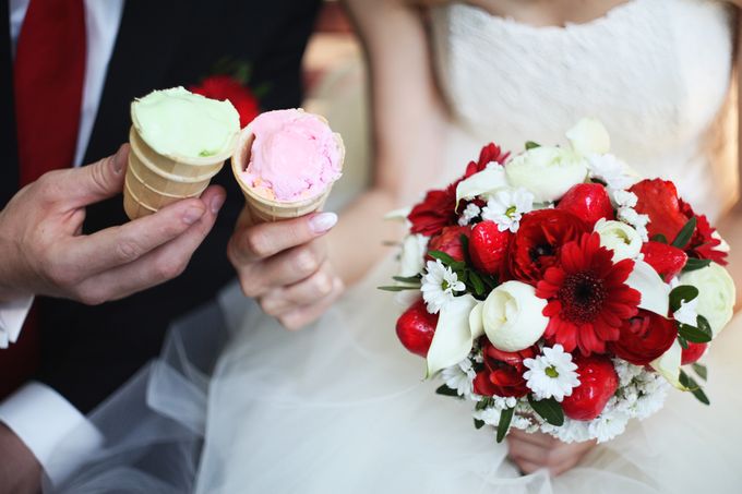 Жених и невеста с мороженым в руках. Невеста с букетом невесты из красных гербер, красных ягод клубники красных роз, белых калл и белых ромашек. Невеста в белом платье держит розовое мороженое, жених в синем костюме и белым мороженым в руке. У жениха красный галстук и бонбоньерка из красной розы