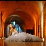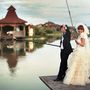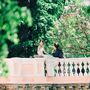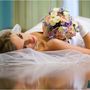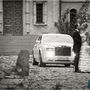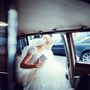 Кадилак молочного цвета, украшенный гирляндами из цветов.