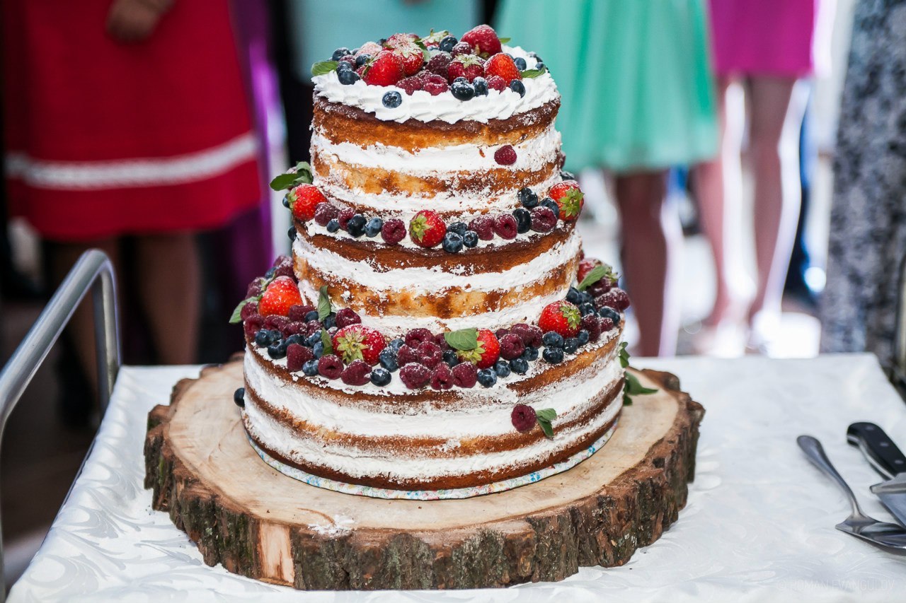 Главное лакомство свадебной вечеринки подавалось на круглой подставке, представляющей из себя деревянный спил.