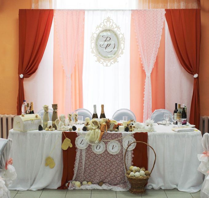 Украшение зала на свадьбу кружевная ткань оранжевый — 3 фото